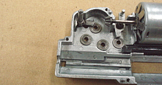さてメカボックスの分解です。まず、メカボックス上部にあるイモネジを緩めます。 別に緩めなくてもいいですが、組み立ての時には締め直さなければいけないので、やっぱり緩めましょう。 |